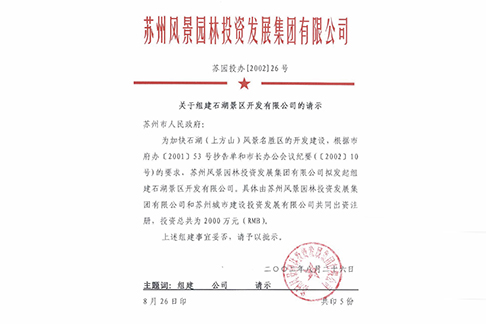 2002年 8月,苏州园林集团与市城投公司共同组建苏州石湖景区的开发。这是集团向景区开发建设领域迈出的历史性一步。
